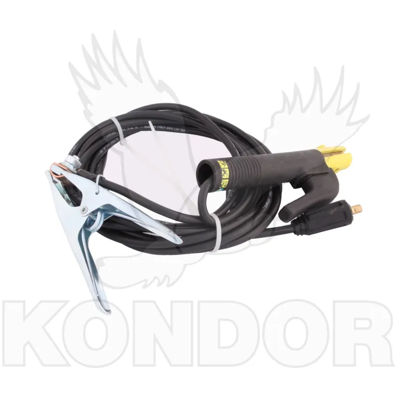 Pár kabelů ke svářečce pro svařování elektrodou. Balení obsahuje malý bajonet do 160 A, držák elektrod, zemnící kleště, kabel 3 m o průřezu 16 mm2, koncovka bajonet malá 10–25 mm.