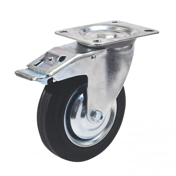 Otočné kolečko s brzdou, se standardní gumovou obručí. Jehlové ložisko, plechový disk. Maximální zatížení 60 kg. Průměr 100 mm.