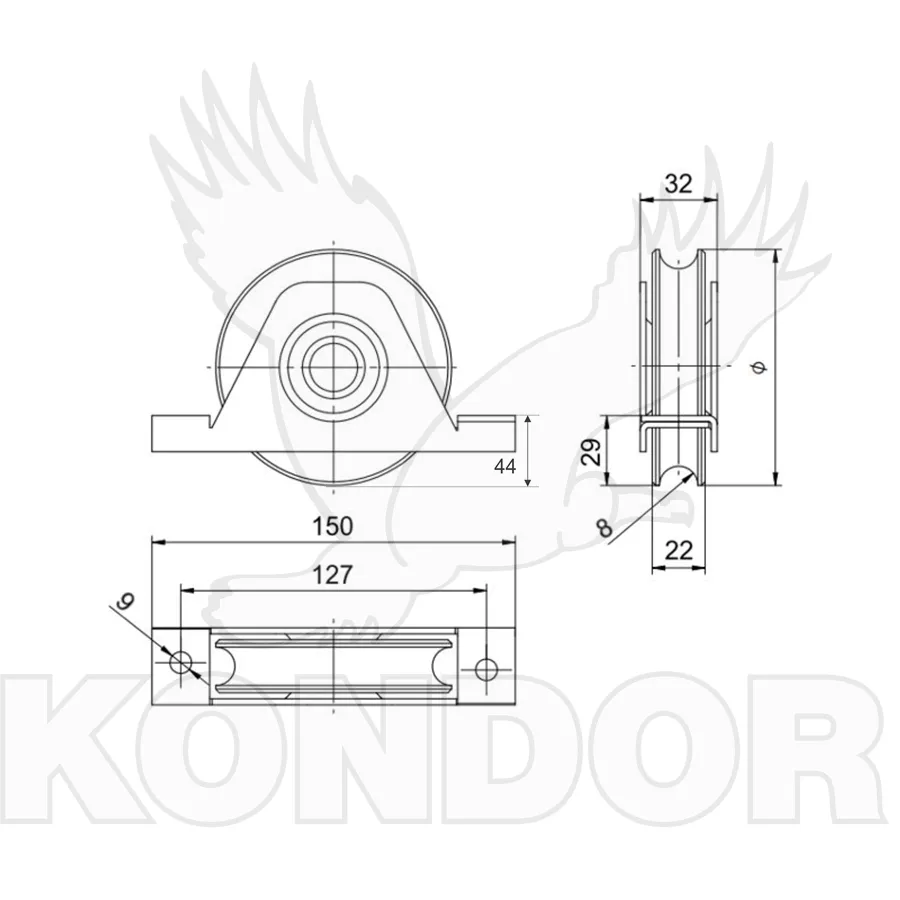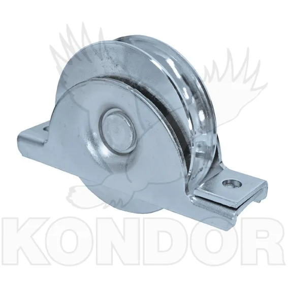 Pojezdové žárově zinkované jednoložiskové kolečko s držákem. Průměr kolečka 100 mm. Určené pro kolečkové (pojezdové) brány maximální hmotnosti 180 kg. Pro kolejnice tvaru "U".