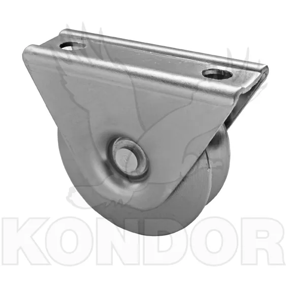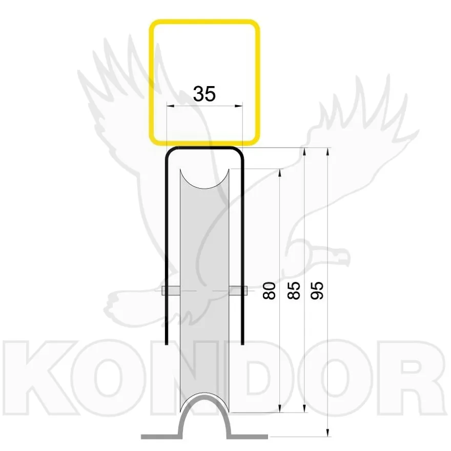 Pojezdová žárově zinkovaná jednoložisková kladka. Průměr kolečka 80 mm. Celková výška H (brány nad zemí) = 95 mm. Určeno k přišroubování do rámu kolečkové (pojezdové) brány o maximální hmotnosti 300 kg.