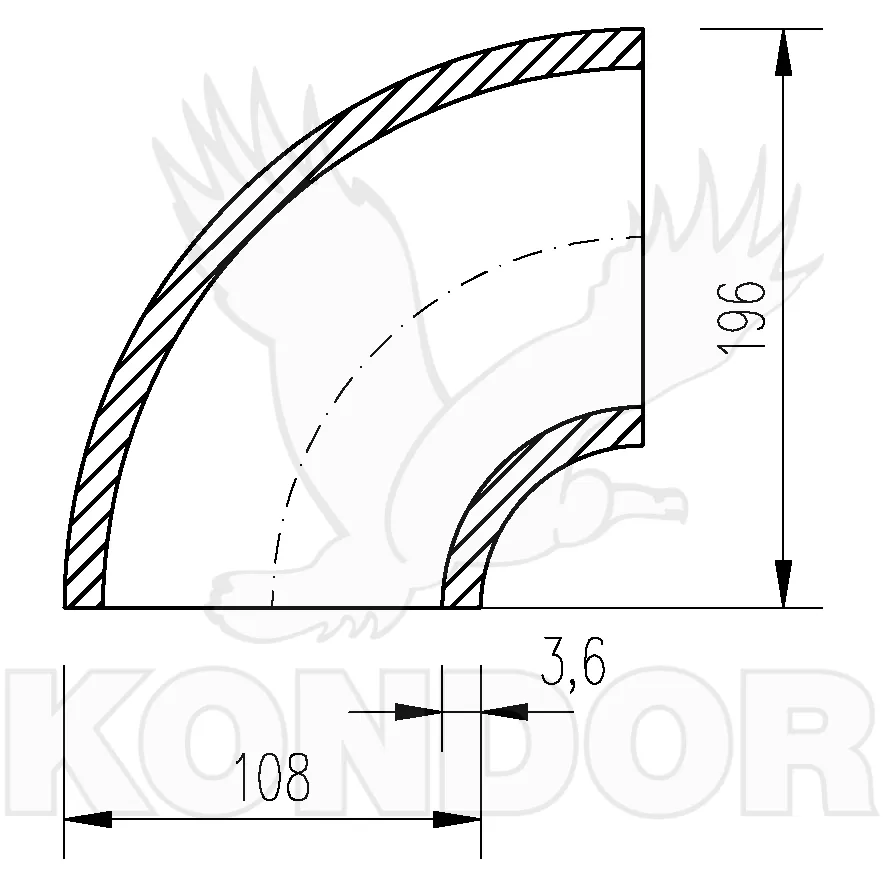 Potrubní tvarovka z uhlíkaté oceli pro spojování přivařeným tupým svárem. Používá se pro přepravu tekutin a plynů, užitkové vody, vzduchu aj. Průměr 108 mm. Tloušťka 3,6 mm. Výška 196 mm.