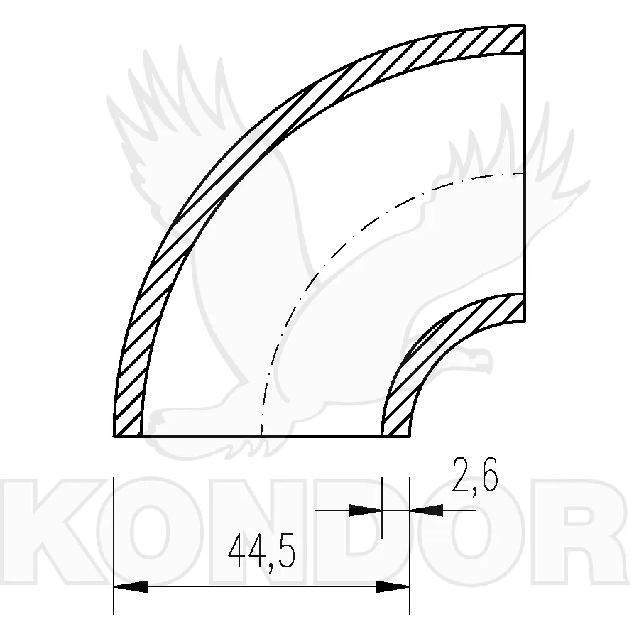 Potrubní tvarovka z uhlíkaté oceli pro spojování přivařeným tupým svárem. Používá se pro přepravu tekutin a plynů, užitkové vody, vzduchu aj. Průměr 44,5 mm. Tloušťka 2,6 mm.