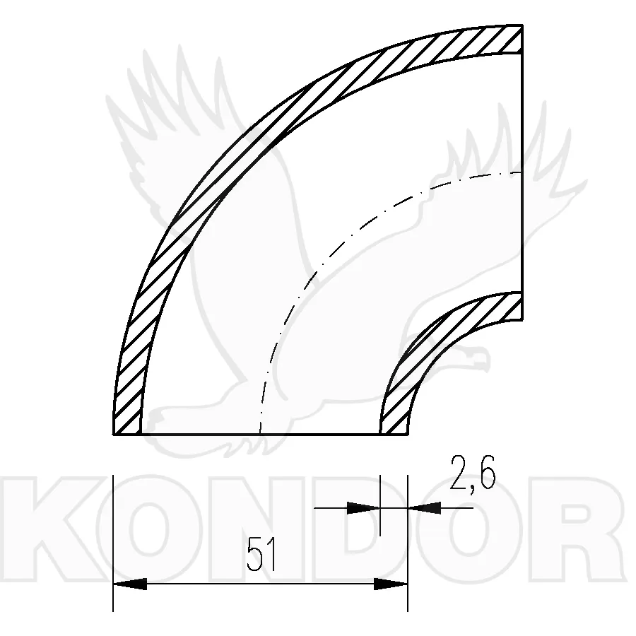 Potrubní tvarovka z uhlíkaté oceli pro spojování přivařeným tupým svárem. Používá se pro přepravu tekutin a plynů, užitkové vody, vzduchu aj. Průměr 51 mm. Tloušťka 2,6 mm.