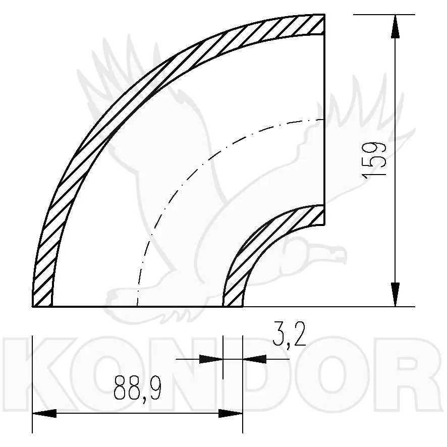 Potrubní tvarovka z uhlíkaté oceli pro spojování přivařeným tupým svárem. Používá se pro přepravu tekutin a plynů, užitkové vody, vzduchu aj. Průměr 88,9 mm. Tloušťka 3,2 mm. Výška 159 mm.