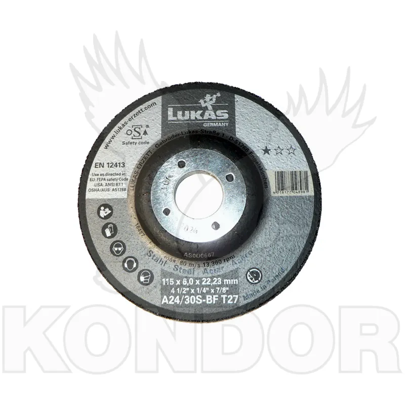 Brusné kotouče jsou vytvořeny pro brusné a hrubovací práce na běžné černé oceli. Jsou určeny pro úhlové brusky. Šířka 115 mm. Tloušťka 6,4 mm. Otvor pro nástavec brusky 22,2 mm.