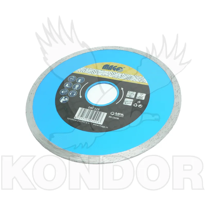Profesionální celoobvodový diamantový kotouč vysoké kvality, určený pro mokré i suché řezání dlažby a obkladů, betonu, cihel, zdiva, žuly, mramoru, kamene, skla, keramiky. Kotouč je opatřen diamantovou vrstvou s vysokým obsahem diamantového prachu a kvalitně zpracovaným napojením na nosný disk kotouče. Průměr 115 mm. Průměr otvoru 22,2 mm.