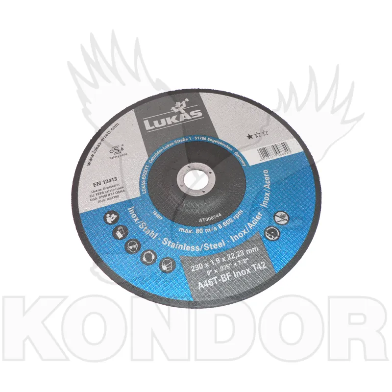 Určen pro řezání běžné černé oceli a nerezové oceli. Řezný kotouč je určen pro ruční a stacionární brusky. Průměr 230 mm. Tloušťka 1,9 mm. Průměr díry 22,2 mm.