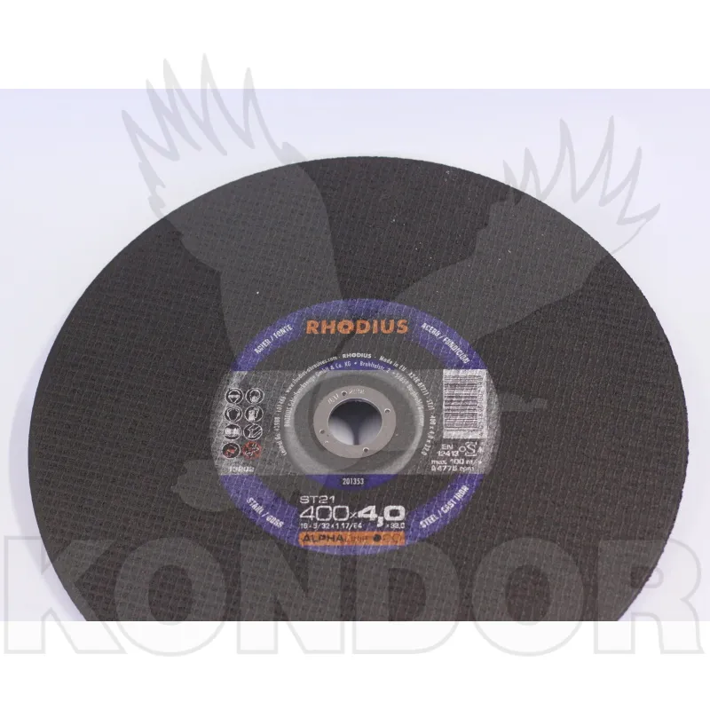 Stacionární rozbrušovací kotouč není vhodný k ručnímu řezání. Zesílené vnější armování pro vysokou pracovní rychlost 100 m/s. Nejčastější použití – vysokopevnostní / vysokolegované oceli, konstrukční oceli, kalené oceli, Hardox a armovací oceli. Průměr kotouče 400 mm. Síla 4 mm. Průměr díry 32 mm.