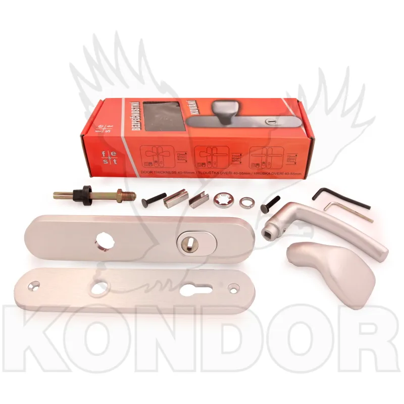 Hliníkové bezpečností kování třídy 3. V sadě kování Klika + knoflík, určeno do tloušťky dveří 40–55 mm, pro jiné dveře je nutné použít prodloužené šrouby. Vložka není součástí sady.