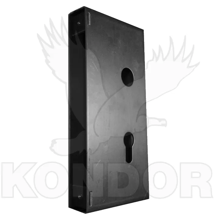 Kapsa pro zámek do jeklu s otvory na vložku a kliku. Šíře krabice 30 mm. Pro zámek se zádlabem 60 mm a roztečí 72 mm. Vhodné pro hákové zámky na vrata.