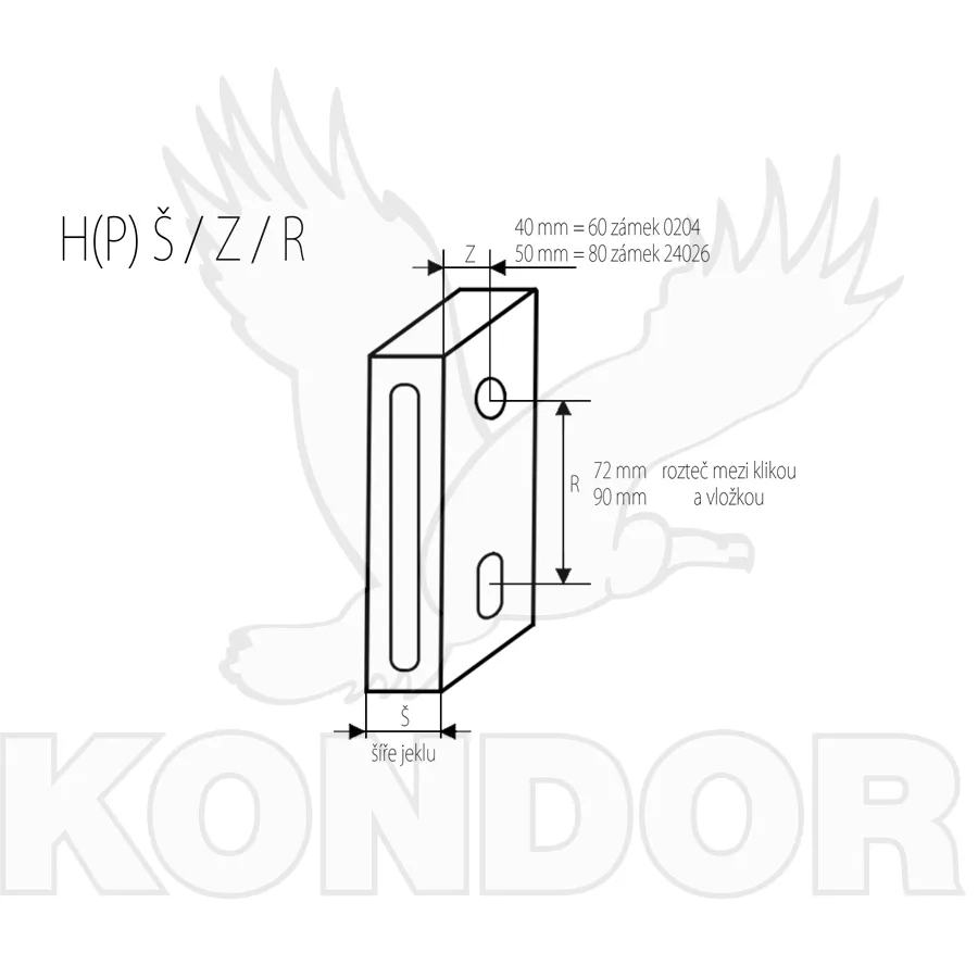Kapsa pro zámek do jeklu s otvory na vložku a kliku. Šíře krabice 40 mm. Pro zámek se zádlabem 80 mm a roztečí 90 mm.