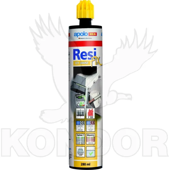 Vinylová pryskyřice bez styrénu. Tato injektážní malta je určena pro profesionální kotvení (systém ResiFIX). Objem kartuše 280 ml, vhodné pro třídy pevnosti 4.6, 5.8, 8.8 a nerezavějící ocel.