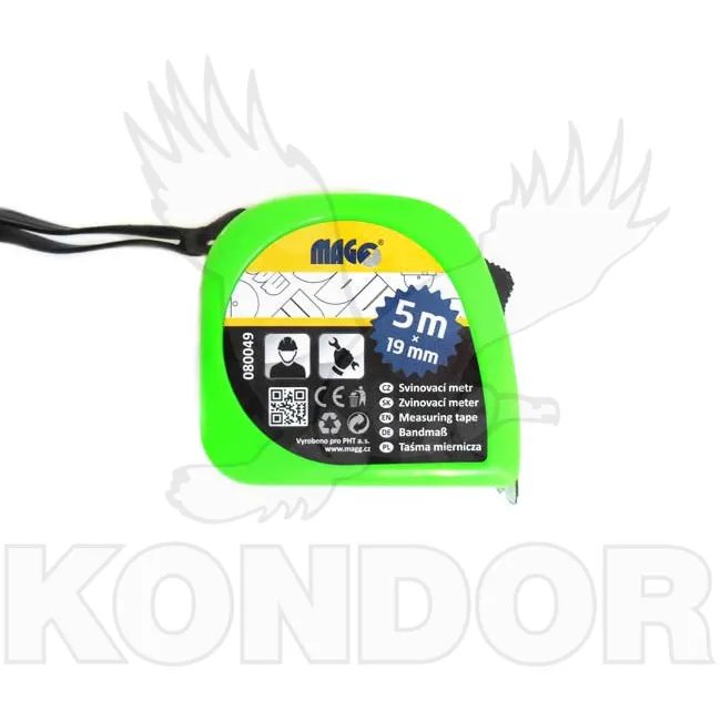 Svinovací metr délky 5 m. Páska široká 19 mm se v zeleném pouzdře s možností aretace.
