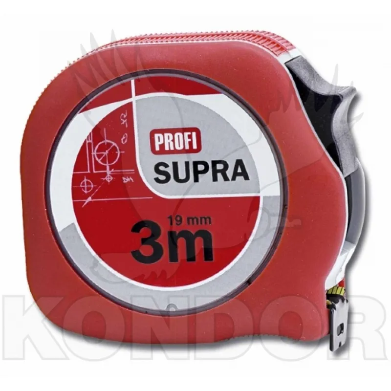 Profesionální svinovací metr ergonomického tvaru SUPRA. Obrázek je pouze orientační – délka metru je 5 m. Šíře pásma 19 mm. Je neklouzavý, má pogumovaný obal z pevné hmoty a vícevrstvou povrchovou úpravu. Matná povrchová úprava stupnice s nylonovým povrchem, s vysokou odolností proti oděru a robustním upevněním koncovky.