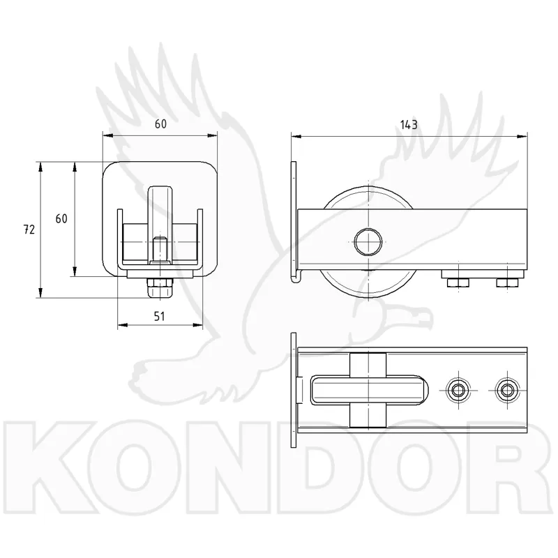 Náběhové kolečko s čelní krytkou pro posuvné samonosné brány. Určeno pro profil 60 × 60 × 4 mm. Žárově zinkované.