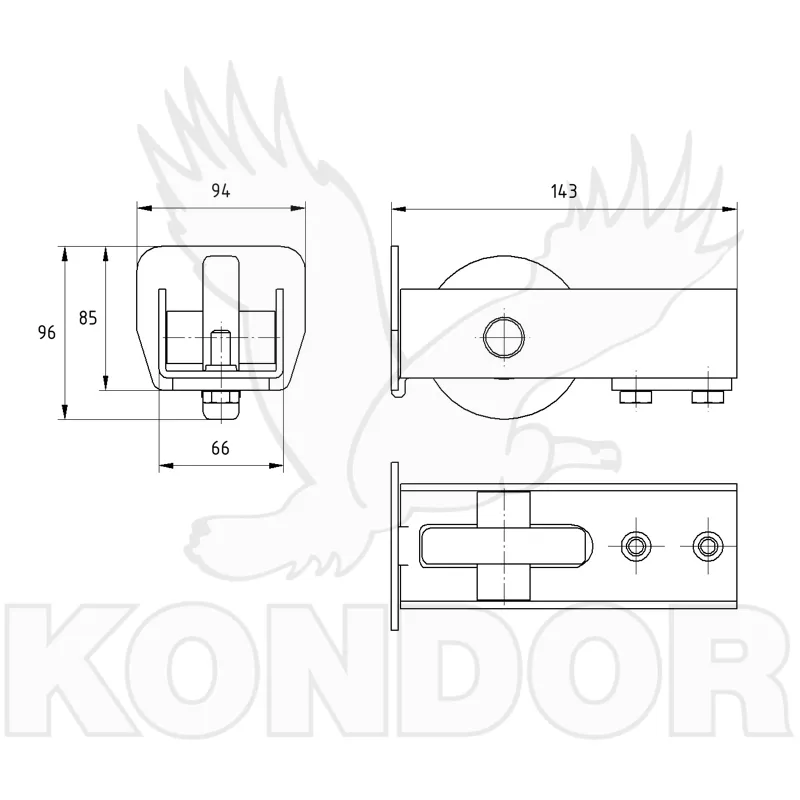 Náběhové kolečko s čelní krytkou pro posuvné samonosné brány. Určeno pro profil 94x85x5 mm. Žárově zinkované.