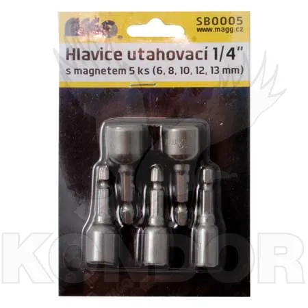 Sada 5 ks utahovacích hlavic s magnetem. Obsahuje velikosti: 6, 8, 10, 12 a 13 mm. Vhodné pro zavrtání samořezných šroubů TEX.