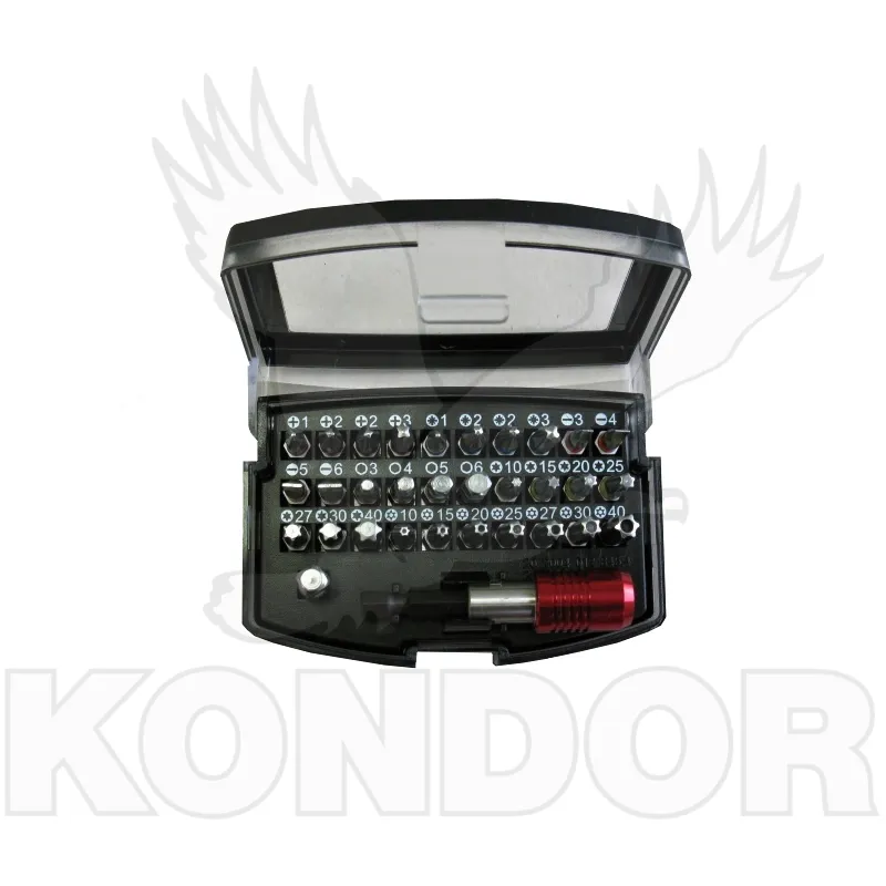 Sada 32 ks nástavců (bitů) v plastovém boxu. Bity Torx v provedení s dírkou.