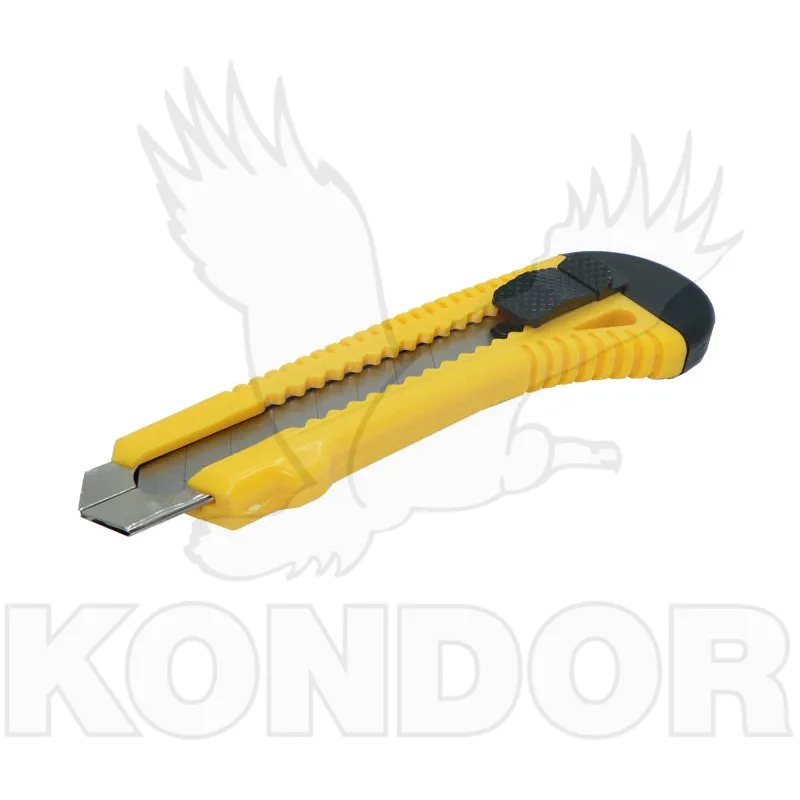 Tenký ostrý odlamovací nůž používaný na látky, papír, koberce, izolace a jiné další materiály. Šíře břitu 18 mm. S kovovým vodítkem a aretací.
