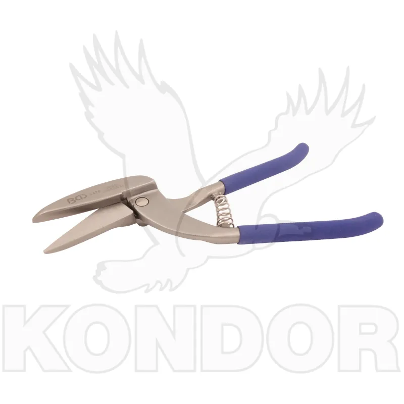 Tabulové nůžky na stříhání plechu. Pro pohodlnější manipulaci jsou madla pogumována.