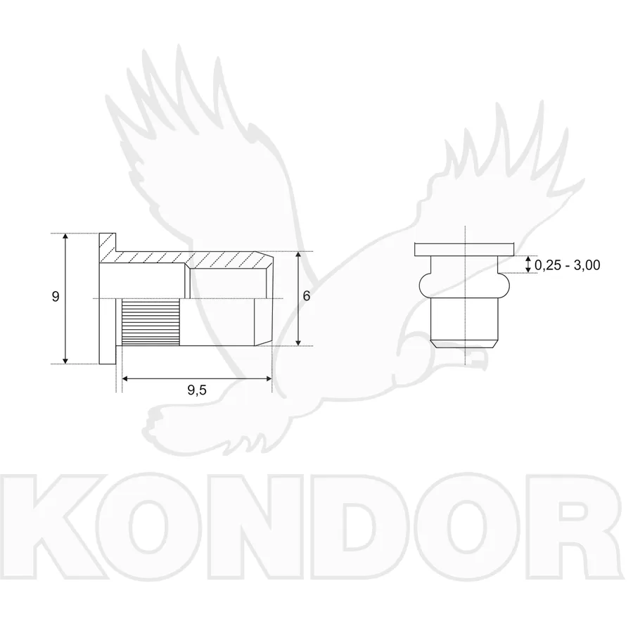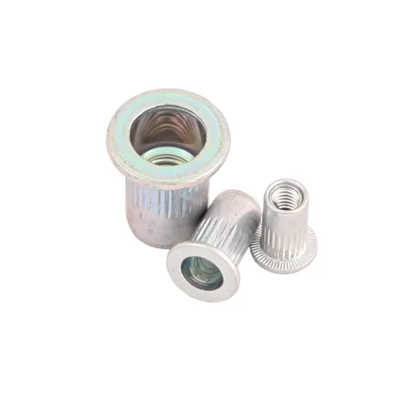 Nýtovací matice s plochou hlavou a metrickým závitem M 4. Provedení galvanický zinek. Určeno pro otvor 6,3 mm.