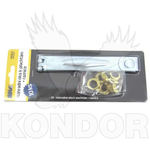 Náhradní oka pro zakrývací plachty. V balení je 10 ok a součástí je i raznice pro montáž oka do plachty.