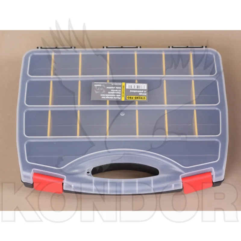 Plastový organizér s 21 přihrádkami a transparentním víkem. Rozměry 380 x 315 x 60 mm.