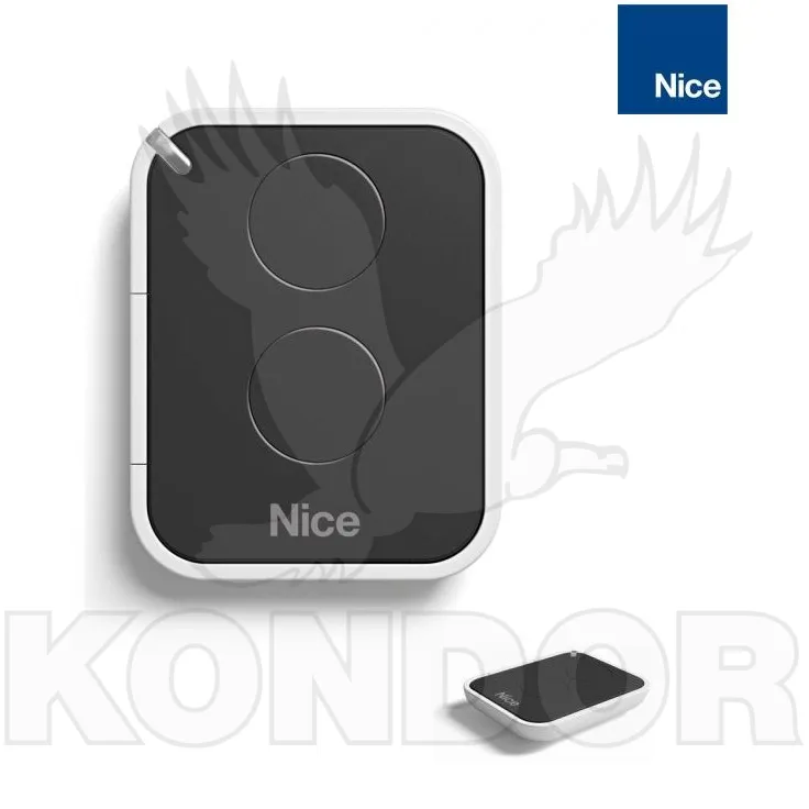 Dvoukanálový ovladač s plovoucím kódem značky NICE s frekvencí 433 MHz. Typ baterie: CR2032.