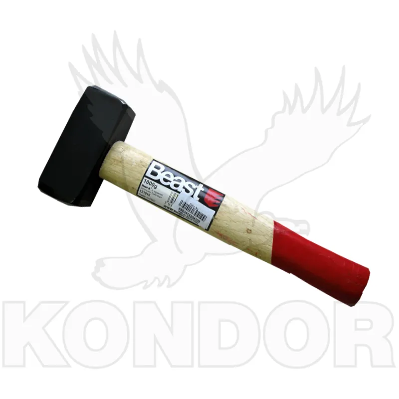 Kovová palice s dřevěnou rukojetí. Hlavice 1 kg s rovnou údernou plochou na obou stranách.