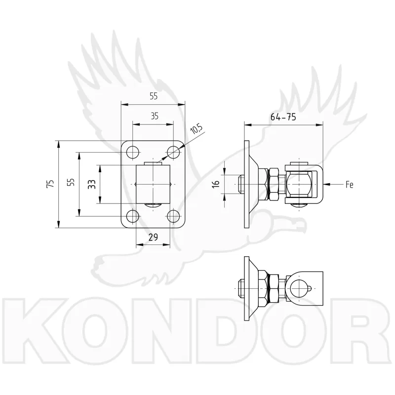 Nastavitelný pozinkovaný závěs s kotvící přírubou o rozměrech 55 x 75 mm. Závit M16. Části na přivaření bez povrchové úpravy. Jednoduchá regulace závěsu pomocí otočné matice. Maximální zatížení křídla brány je 80 kg.