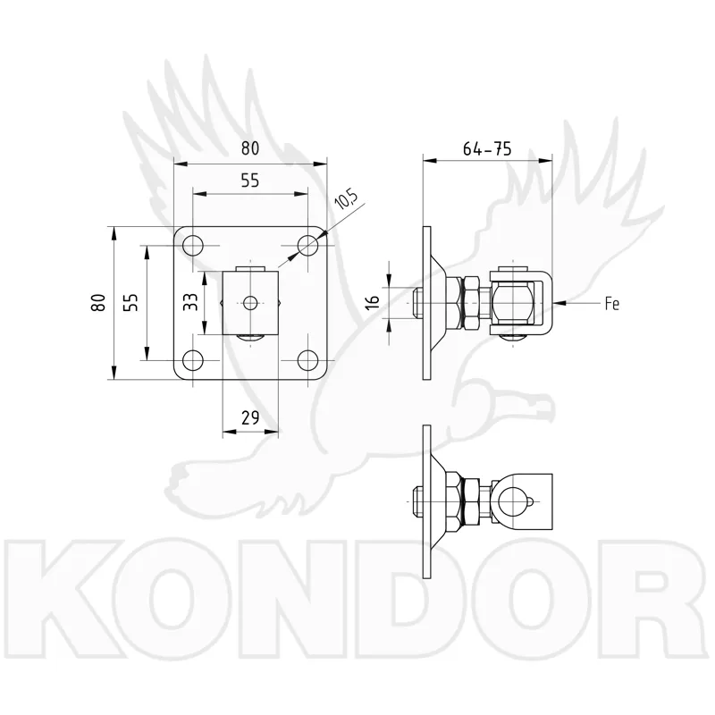 Nastavitelný pozinkovaný závěs s kotvící přírubou o rozměrech 80 x 80 mm. Závit M16. Části na přivaření bez povrchové úpravy. Jednoduchá regulace závěsu pomocí otočné matice. Maximální zatížení křídla brány je 120 kg.