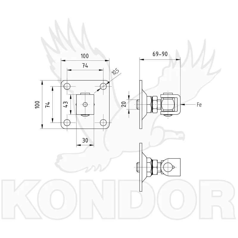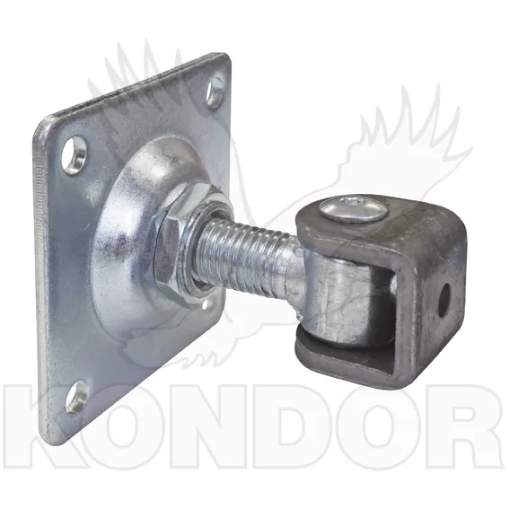 Nastavitelný pozinkovaný závěs s kotvící přírubou o rozměrech 100 x 100 mm. Závit M20. Části na přivaření bez povrchové úpravy. Jednoduchá regulace závěsu pomocí otočné matice. Maximální zatížení křídla brány je 200 kg.