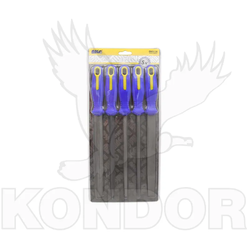 Sada pilníků na kov s plastovou rukojetí. Délka 200 mm, 5 ks s různým tvarem.