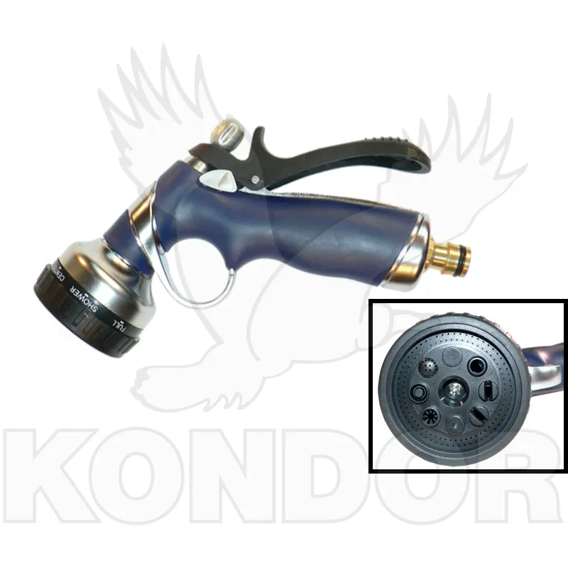 Zahradní stříkací pistole s regulací průtoku vody, možností aretace a volbou z 8 variant rozstřiku. Celokovové tělo zkončené konektorem pro rychlospojku.
