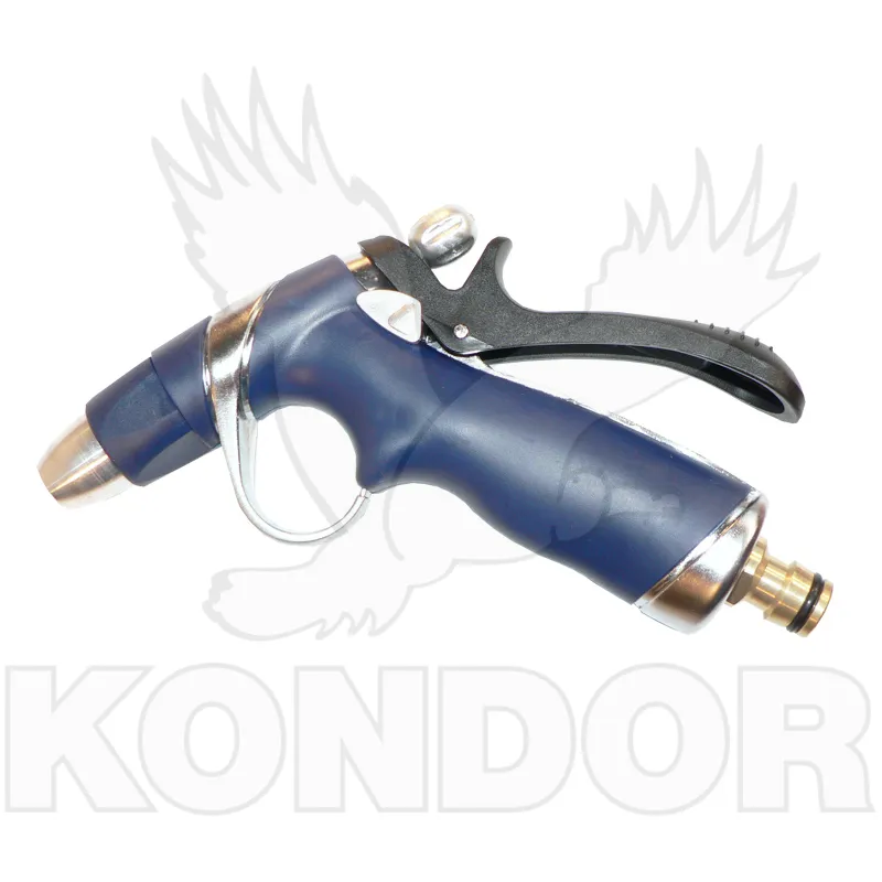 Zahradní stříkací pistole s regulací průtoku vody a možností aretace. Celokovové tělo zkončené konektorem pro rychlospojku.
