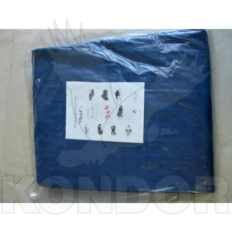 Modrá zakrývací plachta o velikosti 3 x 4 m. Plachta je z plastu a bez problémů odolá dešti. Všechny strany mají kovová očka pro vypnutí plachty.