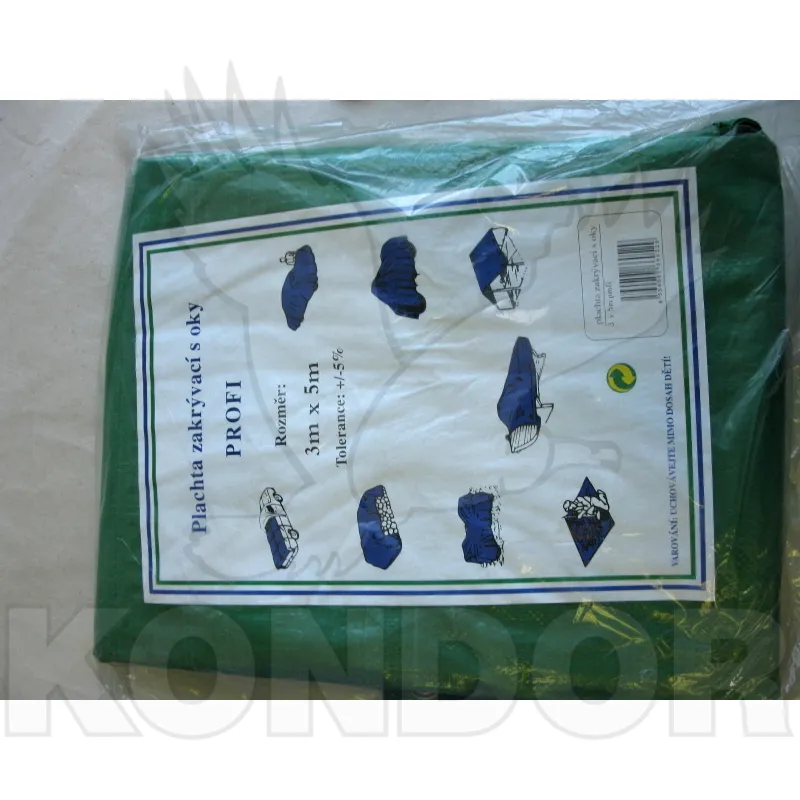 Zelená zakrývací plachta o velikosti 3 x 5 m. Plachta je z plastu a bez problémů odolá dešti. Všechny strany mají kovová očka pro vypnutí plachty.