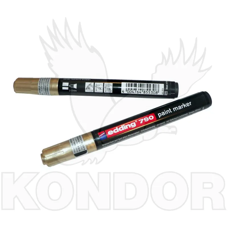 Zlatý lakový popisovač s kulatým hrotem. Permanentní inkoust se slabým zápachem a silnými krycími účinky na způsob laku. Obzvláště vhodný pro tmavé a průhledné materiály. Šíře stopy 2–3 mm