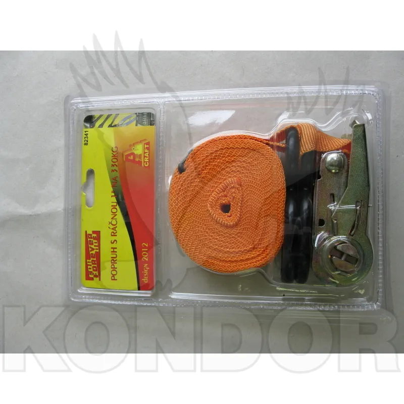 Plochý popruh s ráčnou a hákem pro zajištění předmětů při přepravě. Šíře popruhu 25 mm, délka 4,5 m. Maximální zatížení 330 kg.