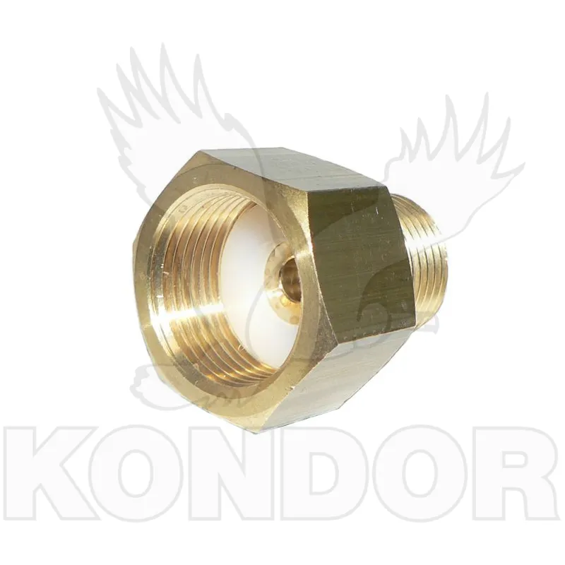 Mosazná redukce závitu z malé tlakové lahve na velkou při zachování stejného redukčního ventilu, která je dodávána s těsnícím kroužkem.
