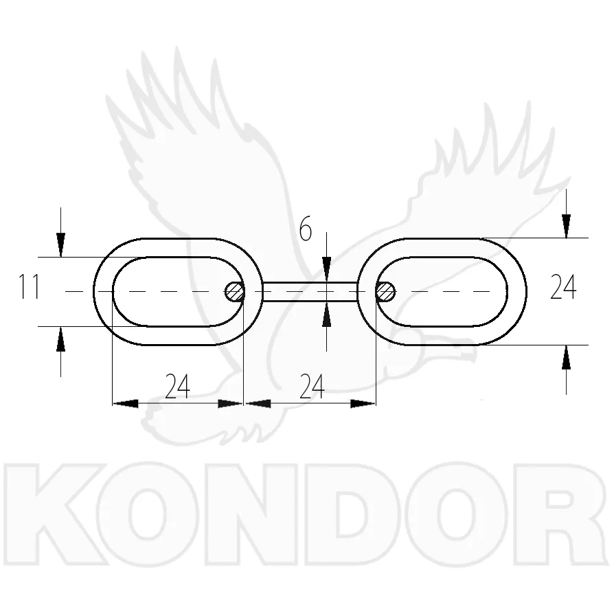 Řetěz s polodlouhými články. Materiál pozinkovaný. Rozměry jednoho oka – průměr 6 mm, vnitřní délka 24 mm, vnější šířka 23 – 24 mm.