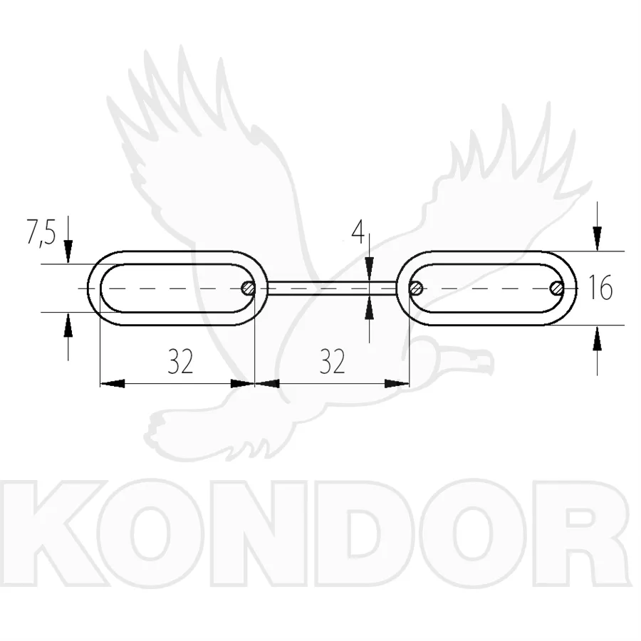 Řetěz s dlouhými články. Materiál pozinkovaný. Rozměry jednoho oka – průměr 4 mm, vnitřní délka 32 mm, vnější šířka 16 mm.