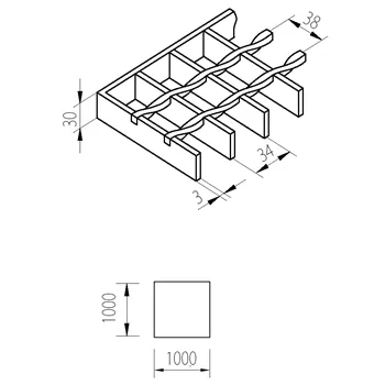 Nosný rozměr je 1000 mm - pásky 30x3mm, nenosný rozměr je 1000 mm - kroucené pruty, velikost oka 34x38