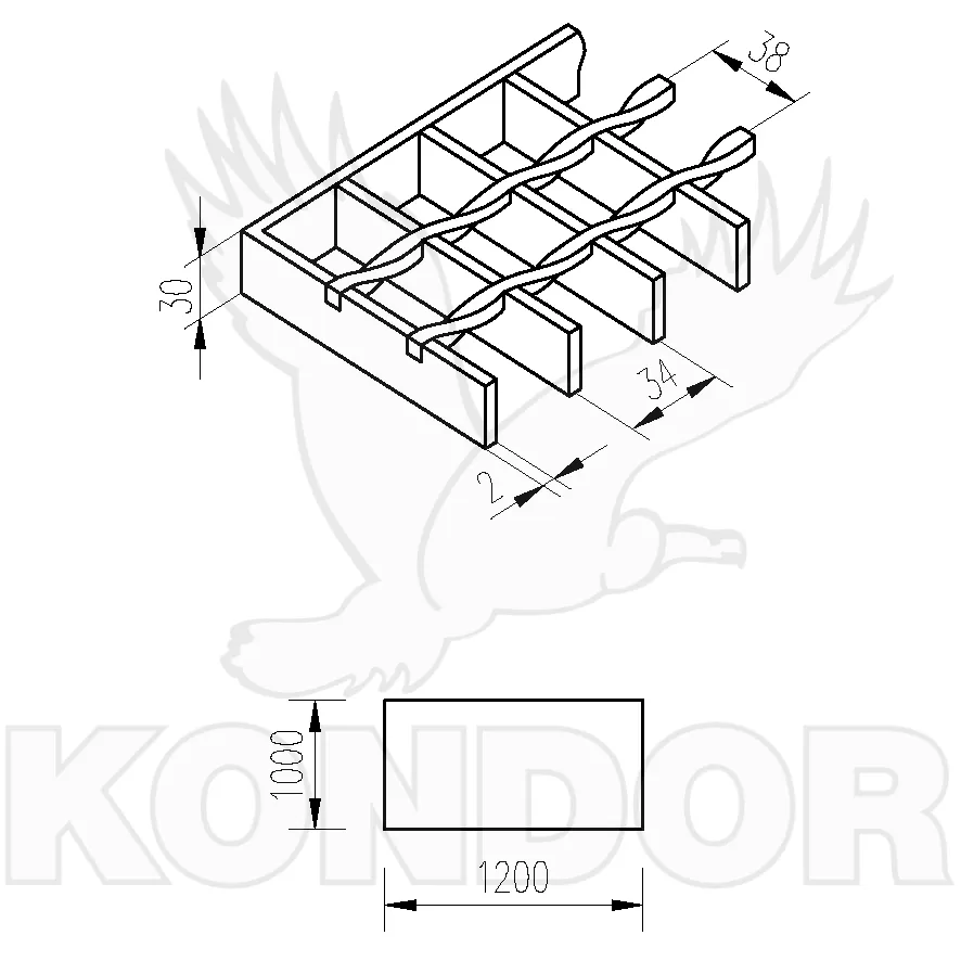 Nosný rozměr je 1200 mm - pásky 30x2mm, nenosný rozměr je 1000 mm - kroucené pruty, velikost oka 34x38, rovnoměrné zatížení 800kg/m2
