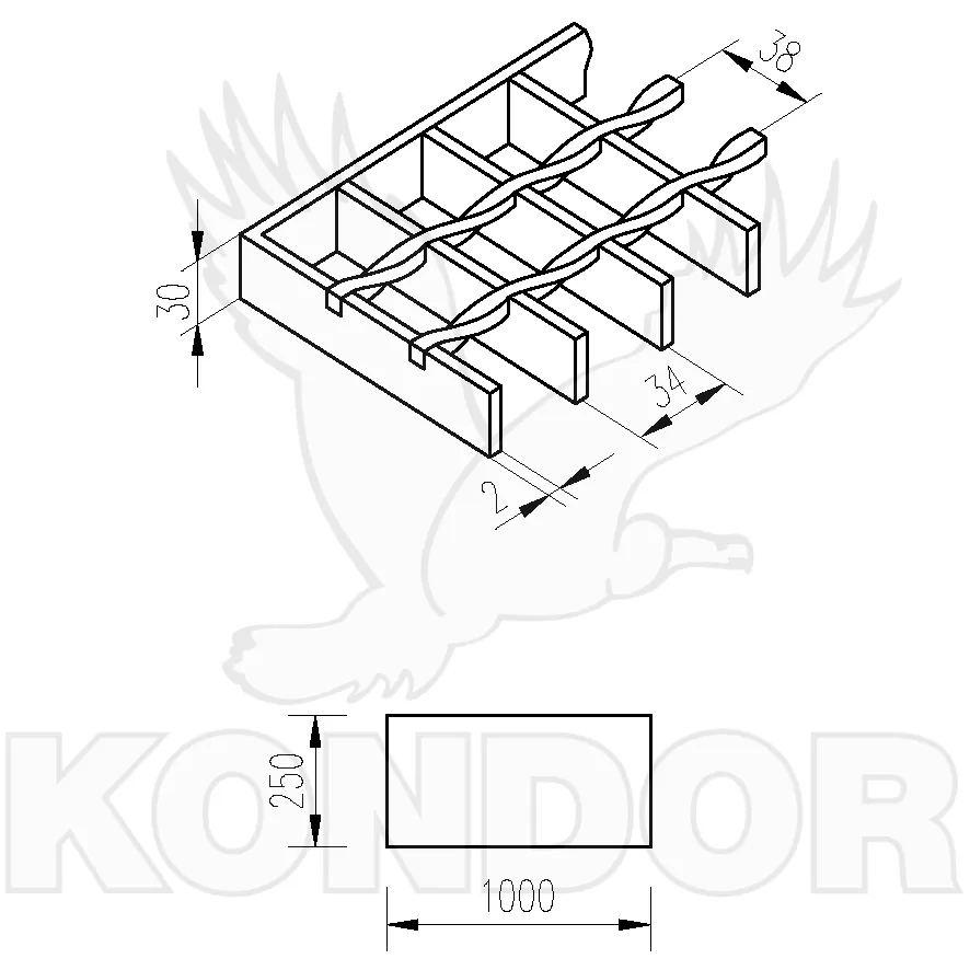Nosný rozměr je 250 mm - pásky 30x2mm, nenosný rozměr je 1000 mm - kroucené pruty, velikost oka 34x38