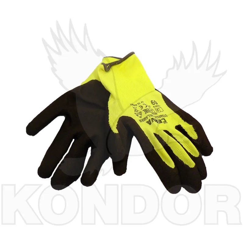 Pletené bezešvé nylonové rukavice s vrstvou mikroporézního paropropustného latexu v dlani a na prstech a pružným nápletem na zápěstí.