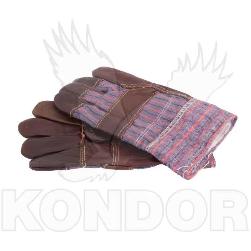 Pětiprsté zimní rukavice z různobarevné nábytkové hověziny se zdvojeným pruhem ve dlani. Hřbet a manžeta z bavlněné tkaniny, podšívka z plyše. Velikost 11.
