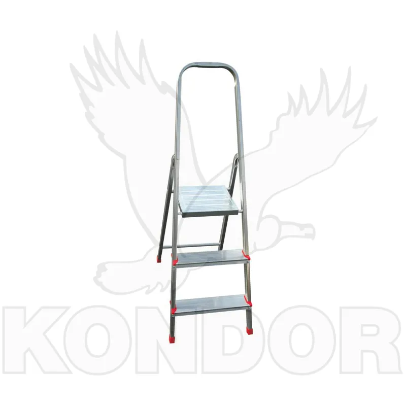 Jednostranné hliníkové schůdky pro domácí použití. Počet schůdků 3, maximální nosnost 150 kg. Výška poslední stojné příčky je 0,57 m. Horní plošina je určena pouze pro odkládání předmětů.