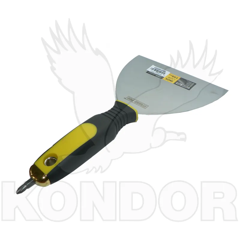 Nerezová špachtle s pohodlnou gumovou rukojetí, která dobře padne do ruky. Šíře 150 mm. Určená pro řemeslné činnosti nebo domácí práce. Součístí špachtle je BIT, který se dá nasadit na konec rukojeti.