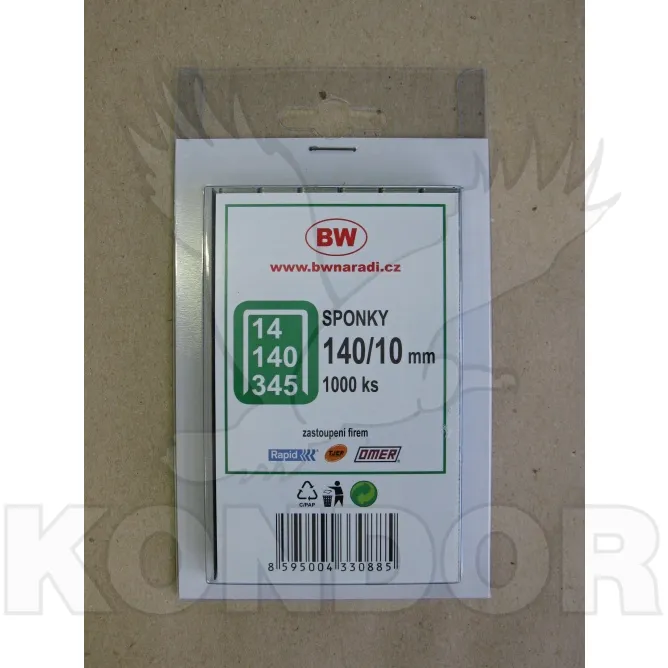 Spony do sponkovačky RAPID Typ 140. Sponky z válcovaného širšího drátu. Ideální na izolace, fólie, lepenku, podlahové krytiny a karton. Šíře sponky 10,6 mm, síla drátu 1,3 mm, výška sponky 10 mm. Balení obsahuje 1000 ks.